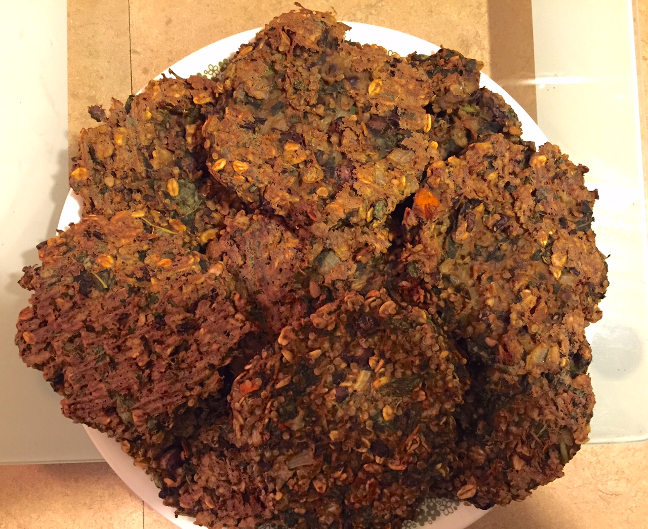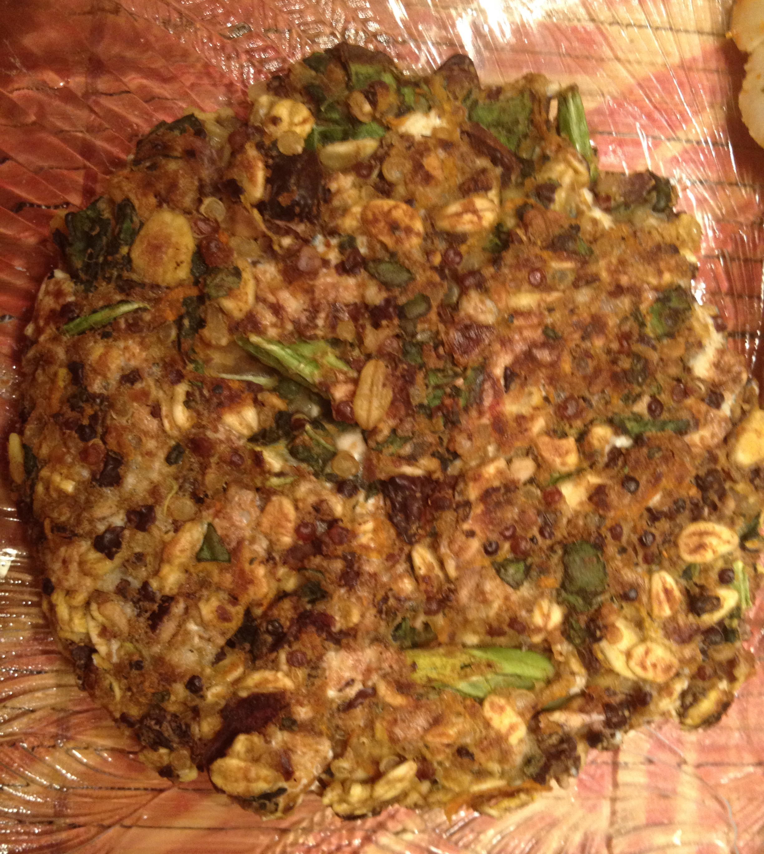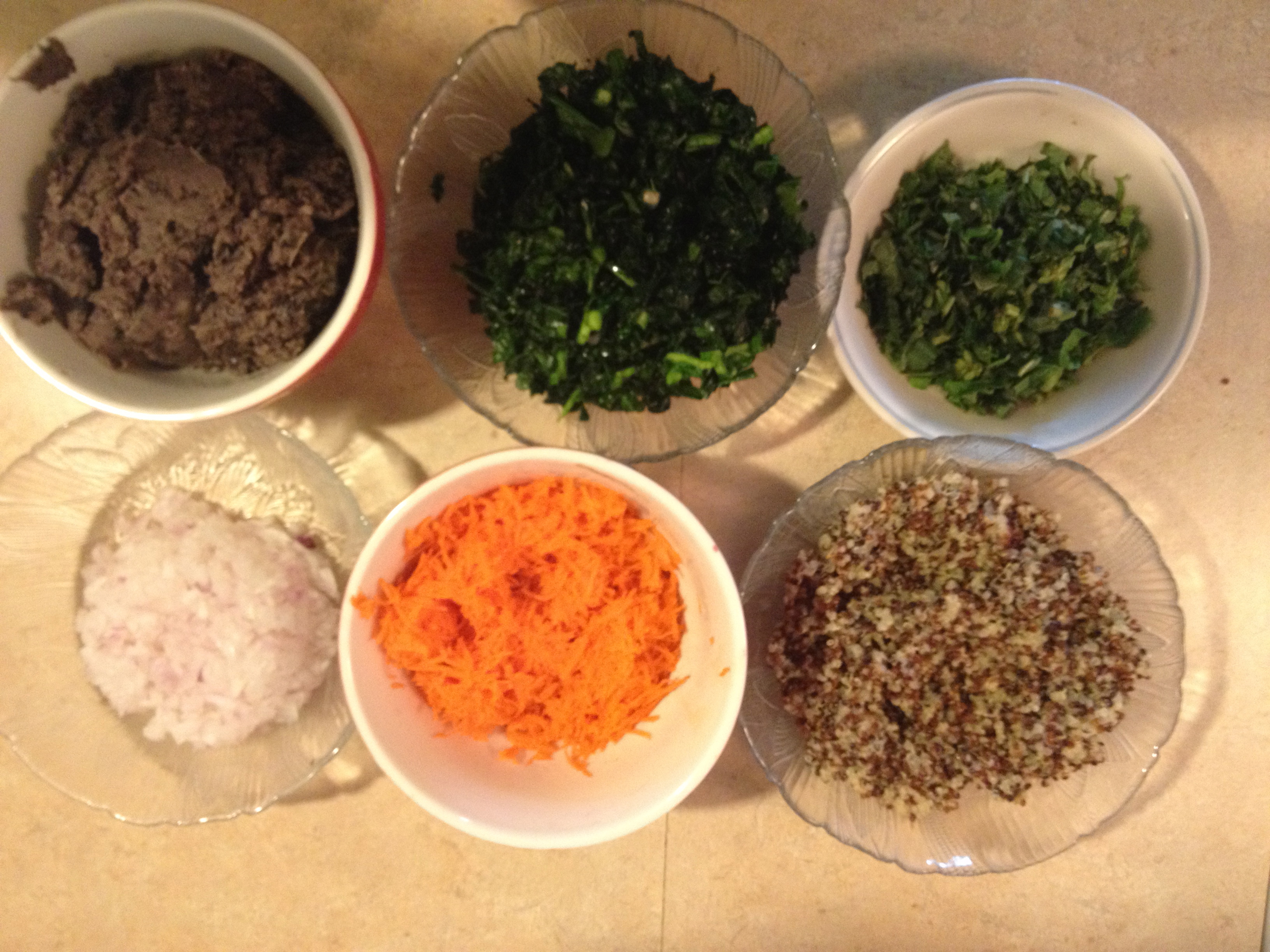 Combine rolled oats, quinoa kale, onion, carrots, garlic, seasonings and herbs. Mix well.