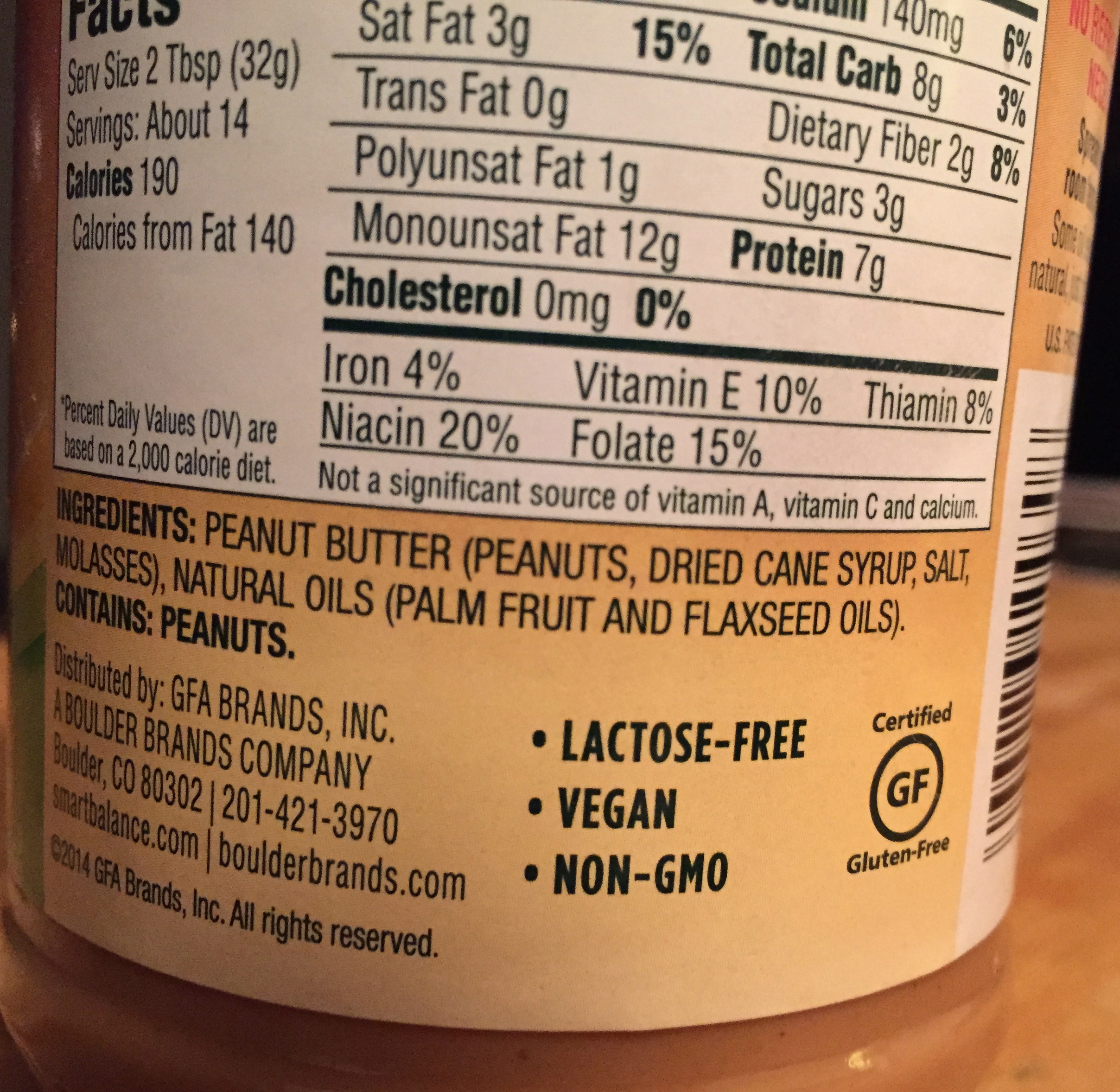 The packaging of the product in the photo below is screaming ‘HEALTHY!’ Non-GMO, zero trans fat, smart, natural, vegan, gf. Even the ingredient list contains all normal items and no unpronounceable additives. Peanuts are naturally high in fat. With cane syrup, salt, molasses and oils added, it is now a potentially addictive food that will undoubtedly be craved by many.